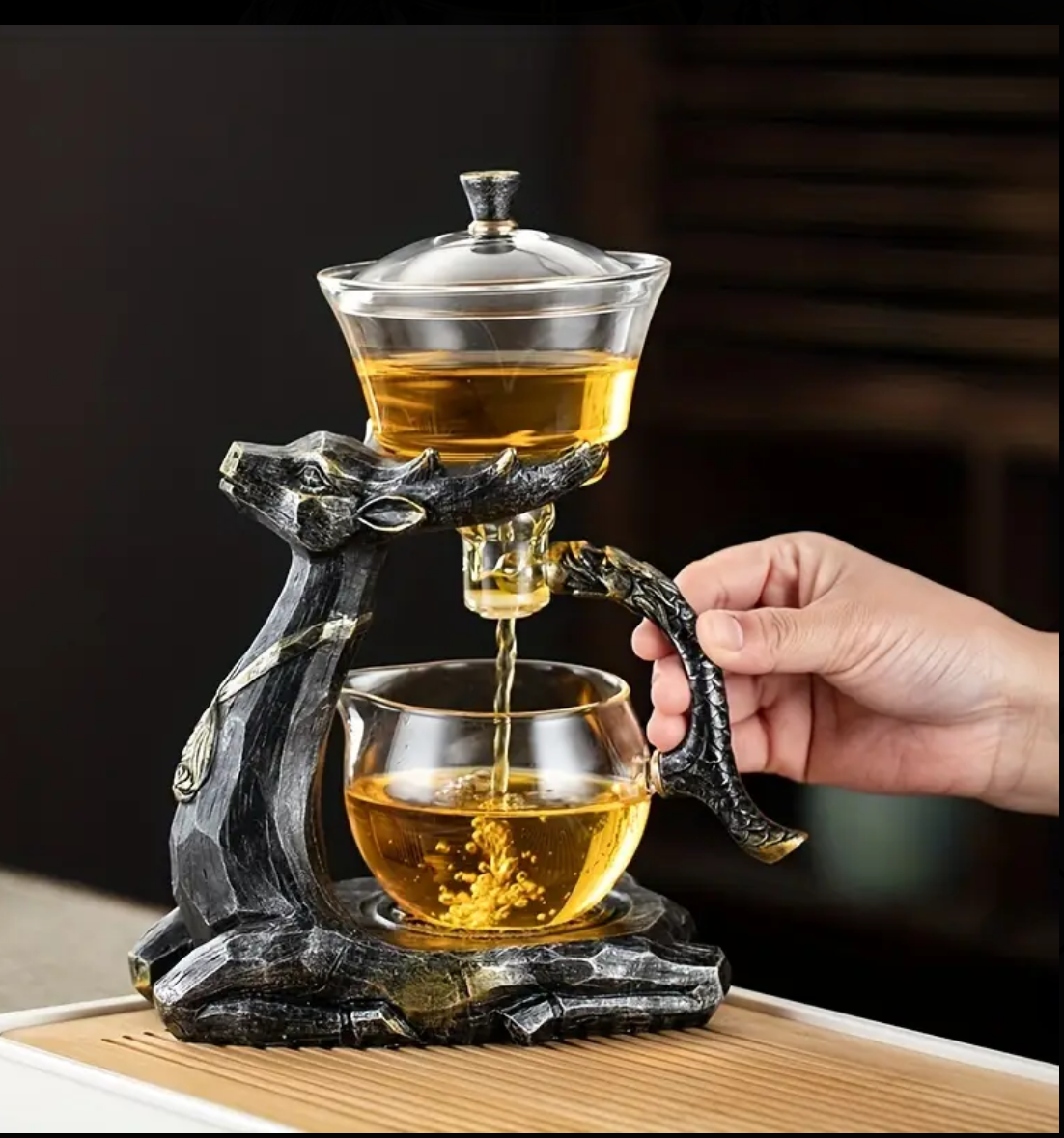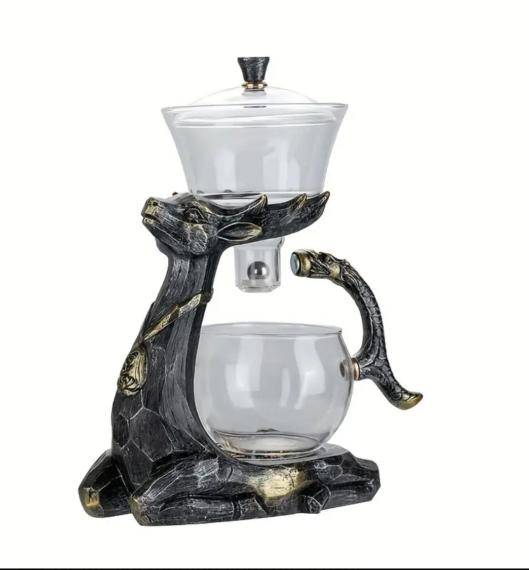 De sculpturale hertentheehouder symboliseert kracht in zachtheid. Hij draagt het glas met dezelfde gratie waarmee de natuur haar ritmes bewaakt.