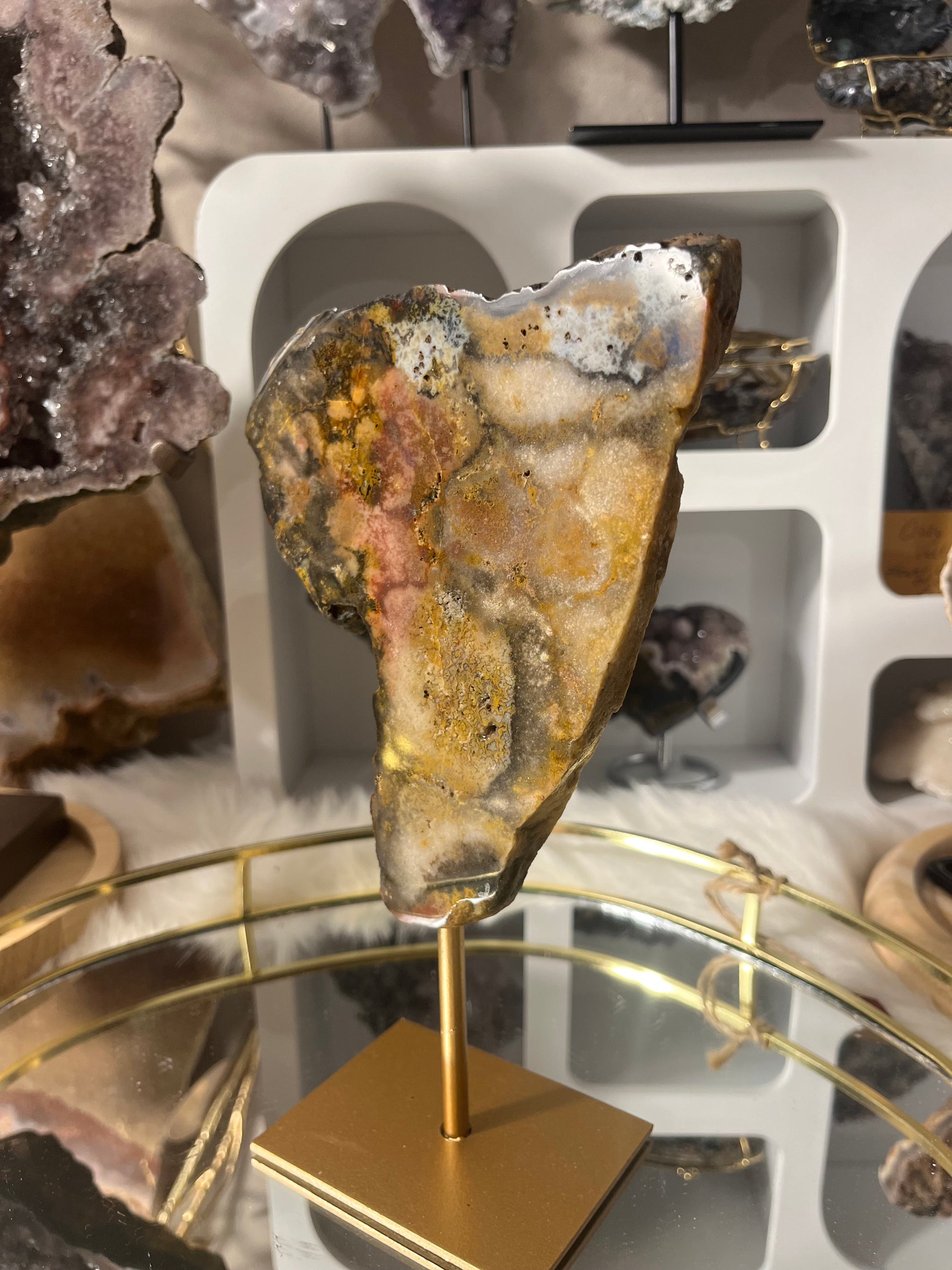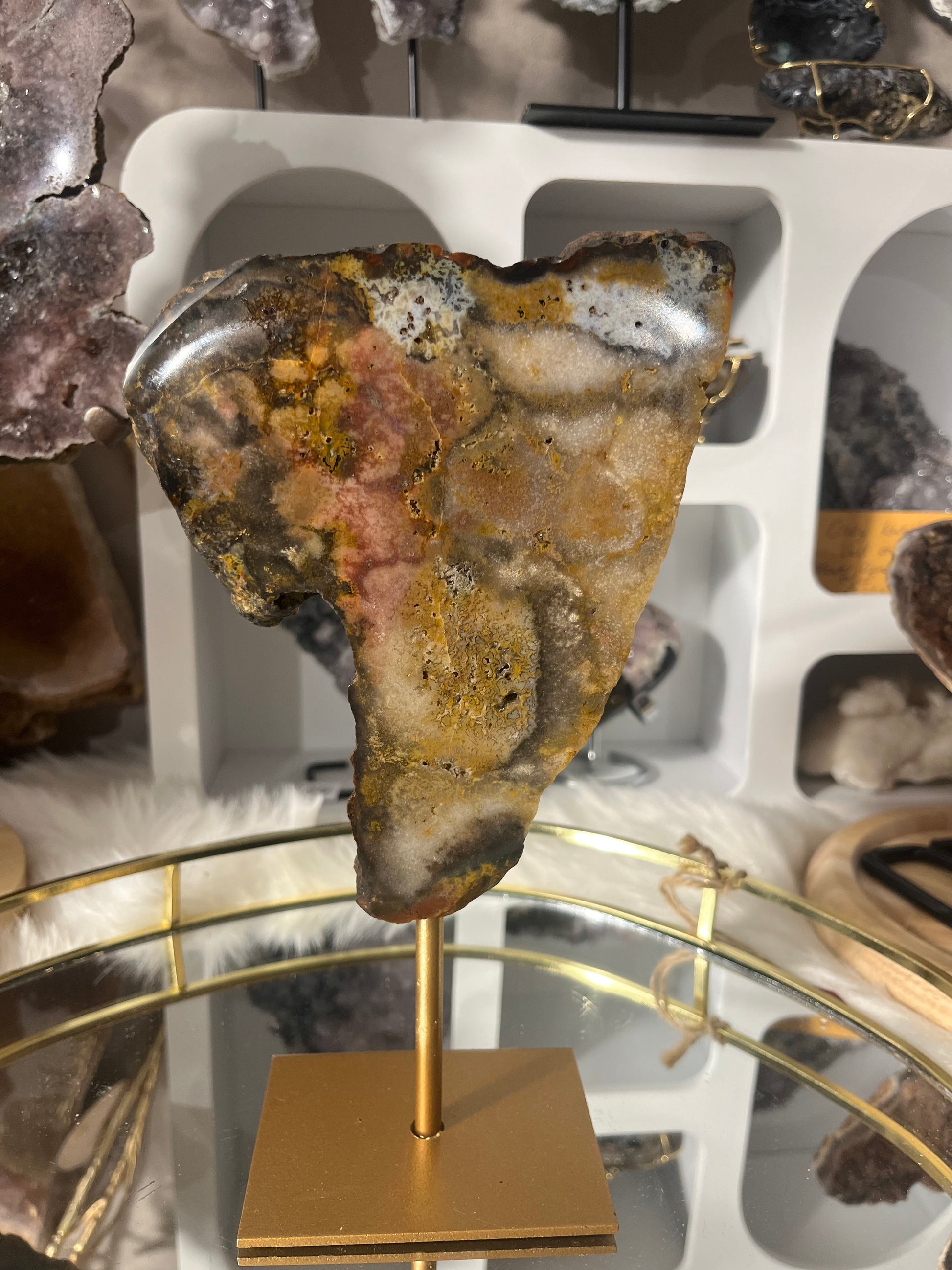 Een aardse schoonheid met warme tinten goud, bruin en roest. In het midden een kleine, fonkelende geode die herinnert aan innerlijk licht en groei.