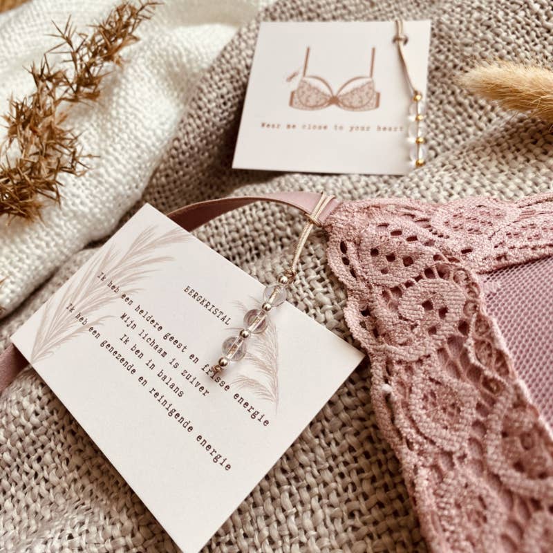 Wear me close to your heart! Hoe fijn om edelsteentjes op deze manier bij je te dragen. Veel vrouwen dragen een edelsteentje met zich mee in de BH, maar dat kan soms onhandig zijn. Deze hangertjes zijn daarom speciaal gemaakt om aan het bandje van je BH te hangen! Maar je kan het hangertje natuurlijk ook aan je sleutels, tas, rits, mobiel, of waar dan ook hangen. Het hangertje wordt geleverd met een kaartje waar de werking van de steen in affirmatie vorm op staat. Het draadje is van dun beige satijn koord en dus lekker stevig.