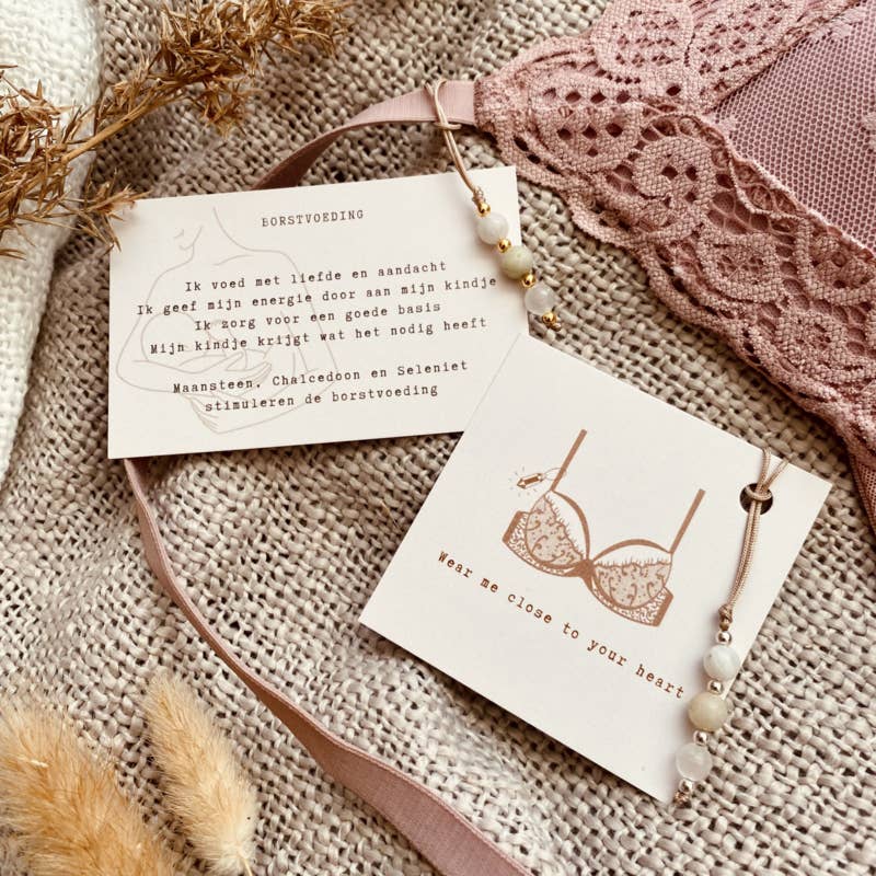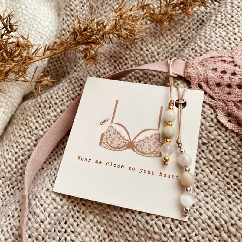 Wear me close to your heart! Hoe fijn om edelsteentjes op deze manier bij je te dragen. Veel vrouwen dragen een edelsteentje met zich mee in de BH, maar dat kan soms onhandig zijn. Deze hangertjes zijn daarom speciaal gemaakt om aan het bandje van je BH te hangen! Maar je kan het hangertje natuurlijk ook aan je sleutels, tas, rits, mobiel, of waar dan ook hangen. Het hangertje wordt geleverd met een kaartje waar de werking van de steen in affirmatie vorm op staat. Het draadje is van dun beige satijn koord en dus lekker stevig. Edelstenen zijn natuurproducten en kunnen dus verschillen van kleur. Let op! Seleniet kan niet tegen water.