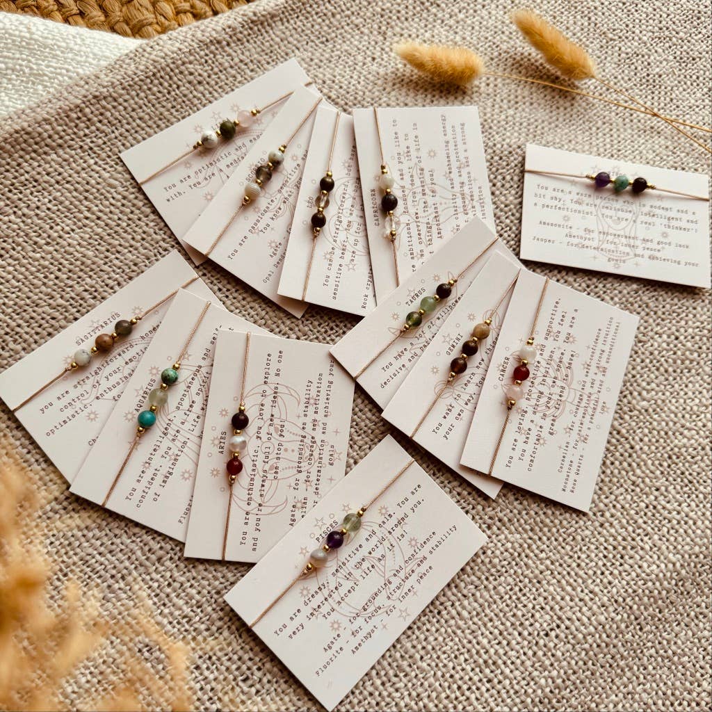 Gemaakt met dun beige satijnkoord, edelstenen en metalen kralen. De armbandjes zijn verstelbaar met een schuifknoopje. Het is een knoopje wat naar één kant openschuift. De armbandjes zitten verpakt om een kaartje waar de werking in affirmatie vorm op staat. M Prijs is per armbandje. Het advies is om de armbandjes af te doen met douchen voor zo lang mogelijk plezier ervan. Toch kunnen wij uit ervaring (van onszelf en onze klanten) zeggen dat de armbandjes heel lang mooi blijven, zelfs als deze 24/7 gedragen worden. Edelstenen zijn natuurproducten en dus uniek. De kralen aan het armbandje wat jij ontvangt kunnen dus wat afwijken van kleur.
