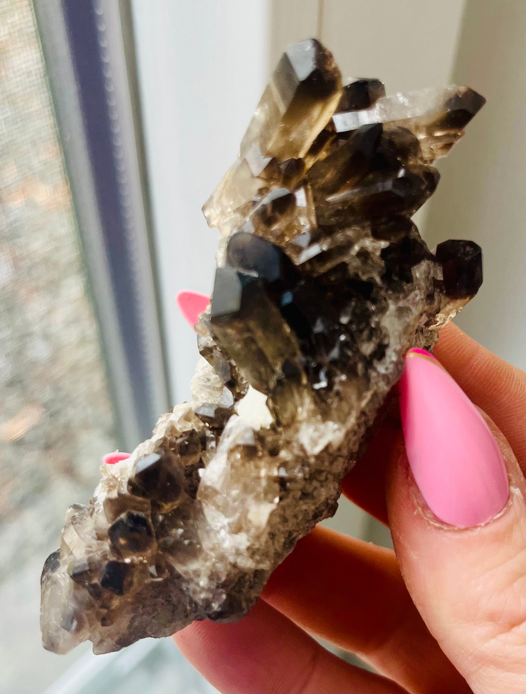 Een krachtige rookkwarts met glanzende punten en diepe aardse tinten.